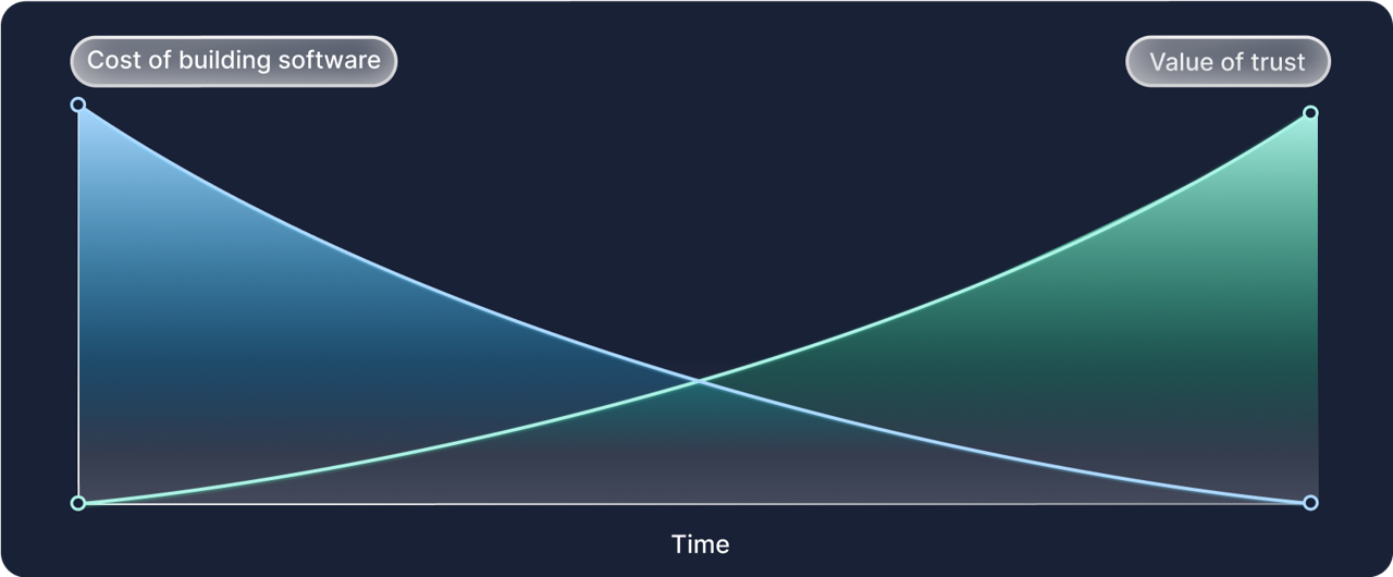 AI makes code necessary but insufficient; trust is the scarcest resource.