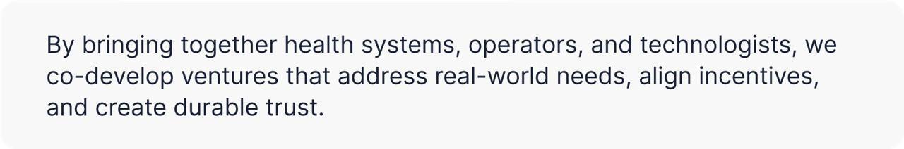This depth of perspective gives us firsthand insight into the constraints, incentives, and complexities health systems face—and it grounds every company we build in practical understanding, not abstraction. We don’t just study the pain points; we’ve lived them.