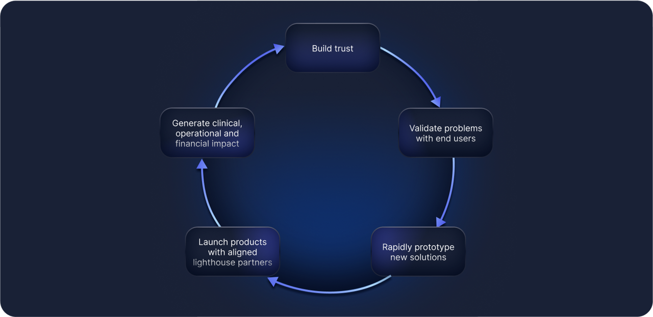 This not only shortens the time to market, it reduces friction in early adoption—ensuring that we’re not just building for health systems, but building with them. By validating demand before scaling up, we make better bets, eliminate waste, and stay closely aligned with the environments in which our companies will operate.