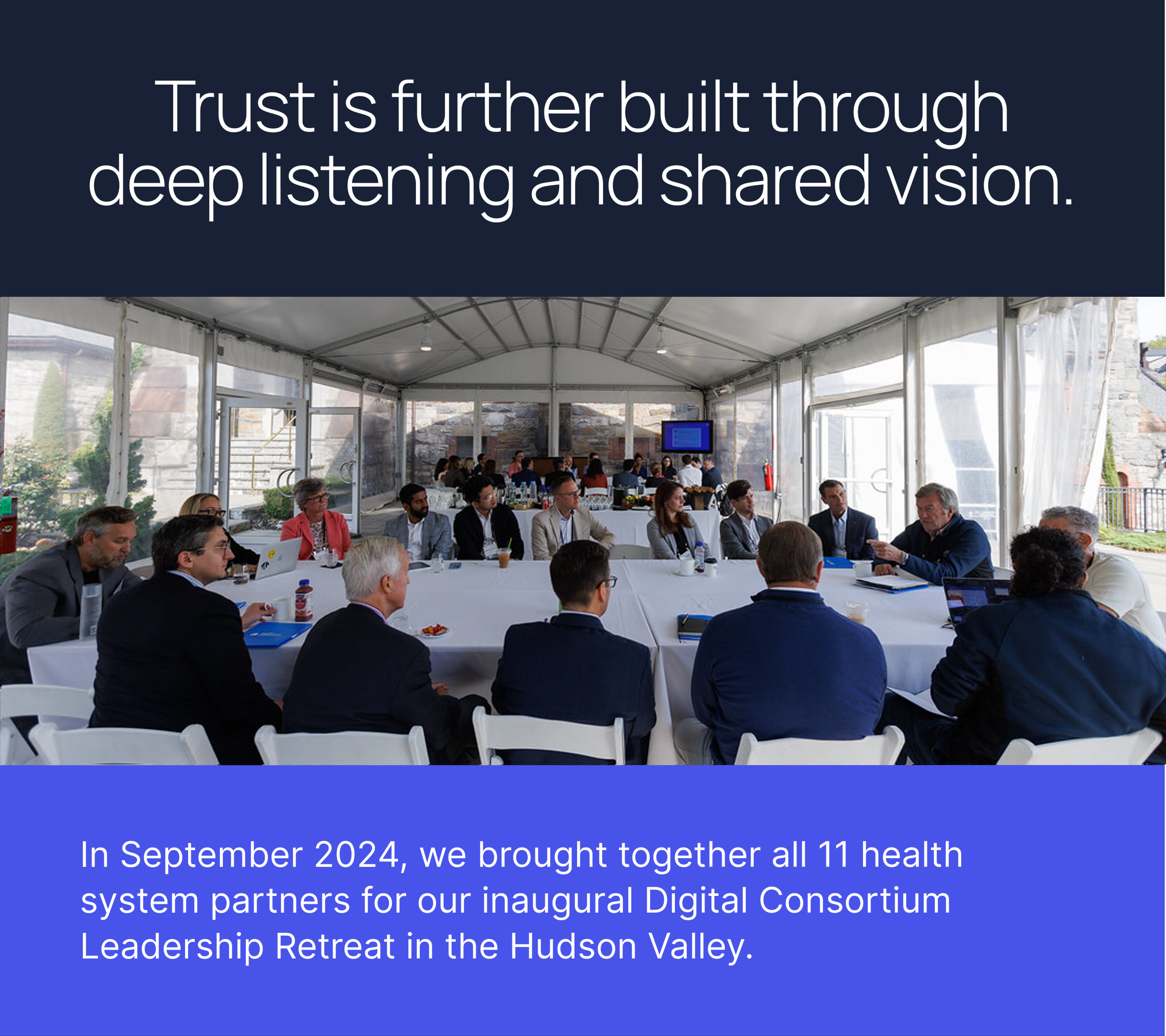 This isn’t just theory—it’s a model we’ve built and proven through the Digital Consortium. Trust, for us, starts with lived experience. Our core team and strategic advisors have collectively held roles within nearly 30 health systems, spanning front-line clinical roles, executive leadership, and board governance. We listen deeply, not only to healthcare leaders shaping policy and strategy, but also to the front-line clinicians and staff who experience system challenges every day.